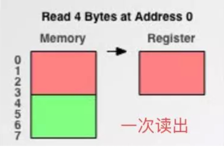 以4字节存取粒度的处理器为例,读取一个int变量(32bit 系统), 处理器只能从4的倍数的地址开始。假如没有内存对齐机制,将一个int放在地址为1的位置。现在读取该int时,需要两次内存访问。第一次从0地址读取,剔除首个字节,第二次从4地址读取,只取首个字节;最后两下的两块数据合并入寄存器,需要大量工作。